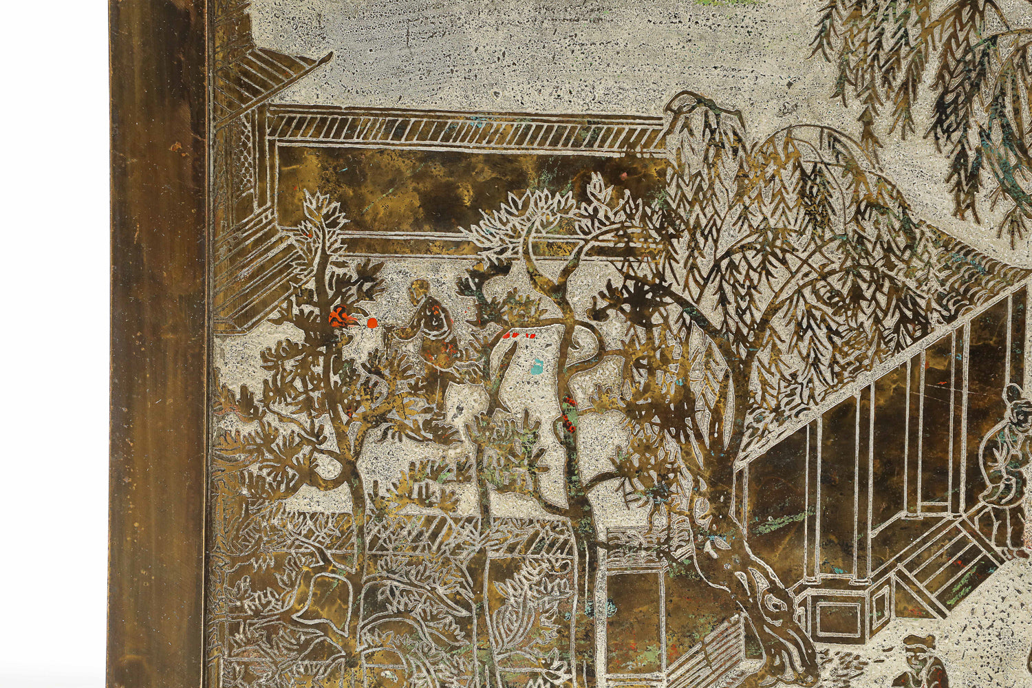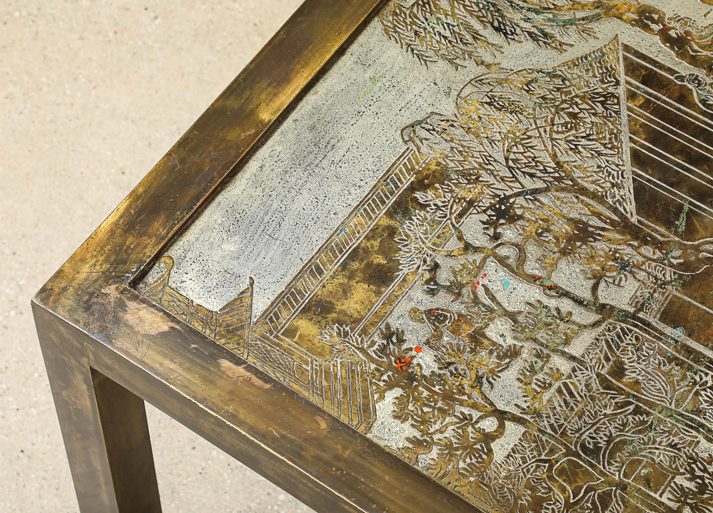 USA | c. 1962 Bronze, pewter, wood. Acid-etched relief pattern on metal with wood. Artist-signed in 2 places on the top.