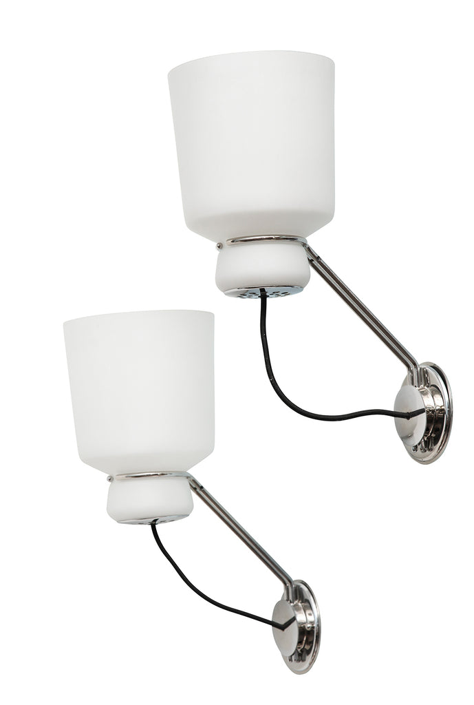 Italy | c. 1958 Chromed steel & polished aluminum structures. Large frosted glass shades. 1 edison socket per sconce. Signed with manufacturer's sticker. Design attributed to architects Carlo Santi & Vittorio Borachia based on other very similar pieces they did.