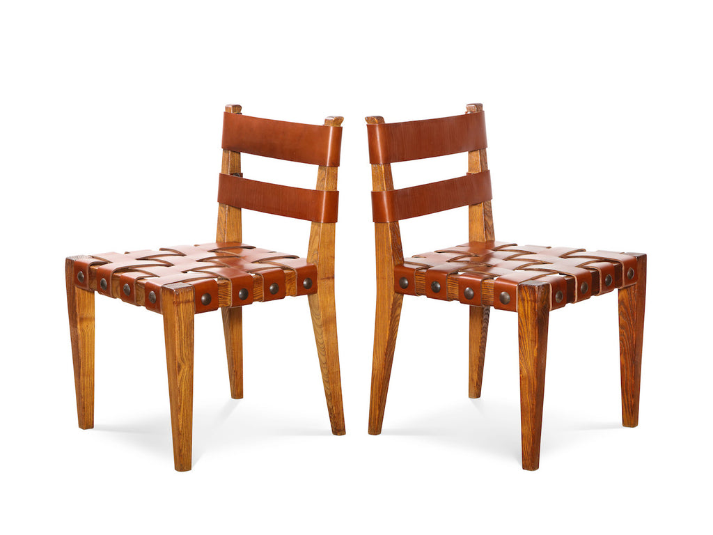 Italy | c. 1937 Model # 4346/ 4350. Open-grain ash frames with dark leather strapping and large patinated metal tacks. A rare and early Borsani design.