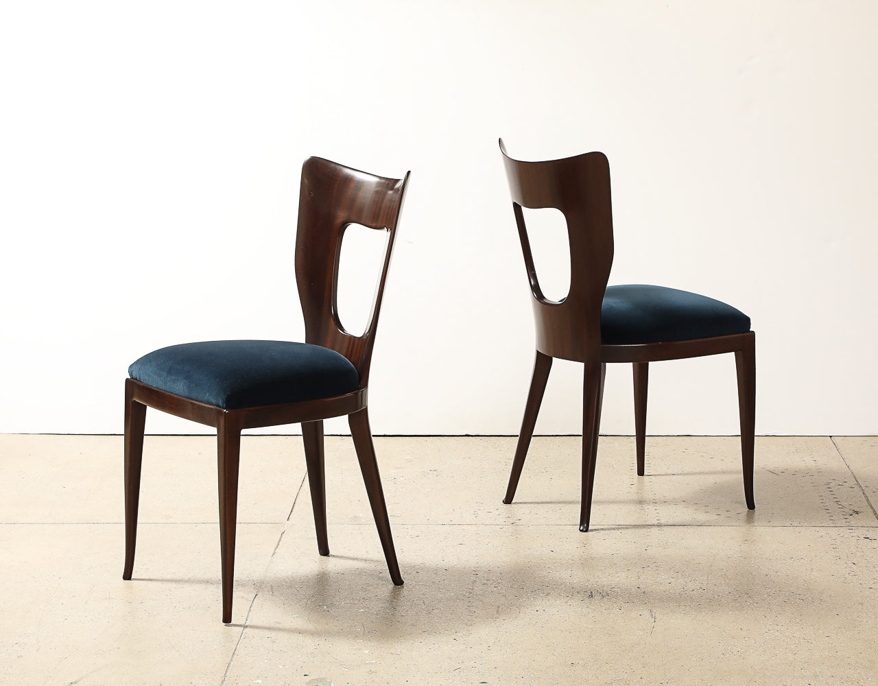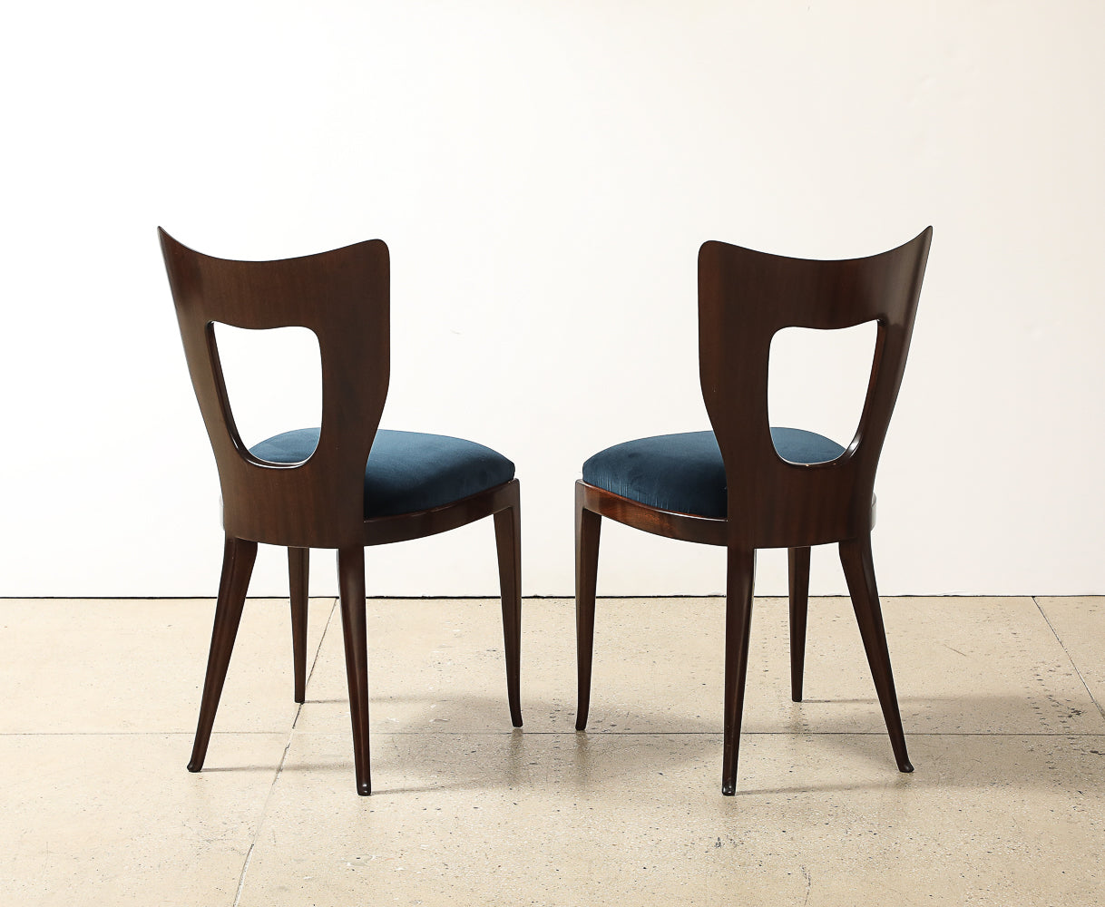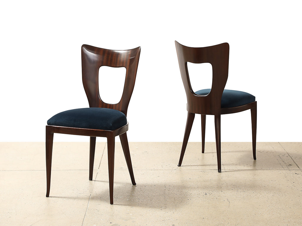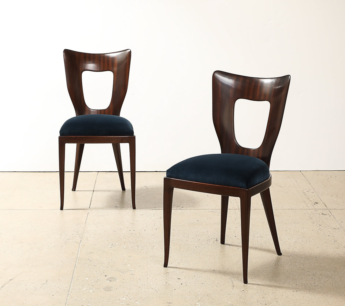 Mahogany, fabric. Sculptural dining/ side chair of solid mahogany with upholstered seat. This model was first presented at the 1951 Triennale exhibition in Milan. These chairs are being offered as a complete set of four.