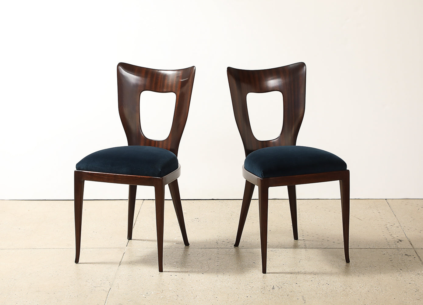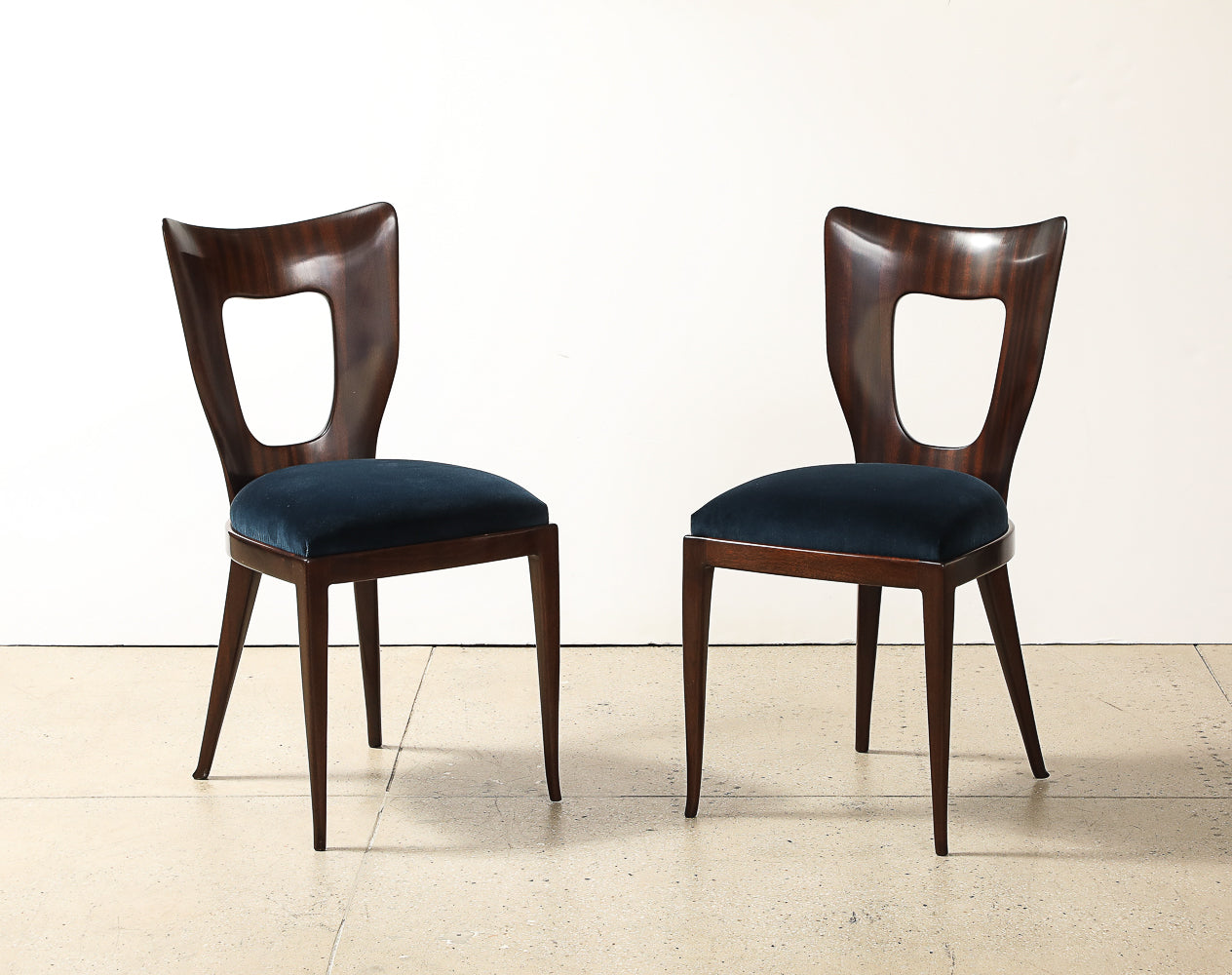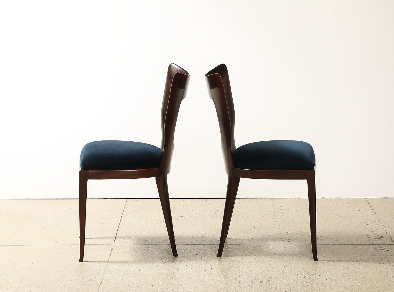 Mahogany, fabric. Sculptural dining/ side chair of solid mahogany with upholstered seat. This model was first presented at the 1951 Triennale exhibition in Milan. These chairs are being offered as a complete set of four.