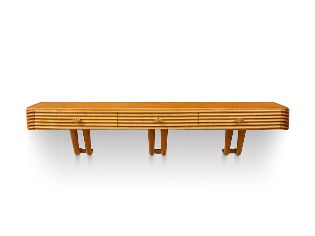 Bleached maple. 3 drawers, each with a carved wood pull. Incised vertical relief across the face & tapering dowel supports. A rare model in very nice restored condition. This piece has been authenticated by the Archivio Osvaldo Borsani.